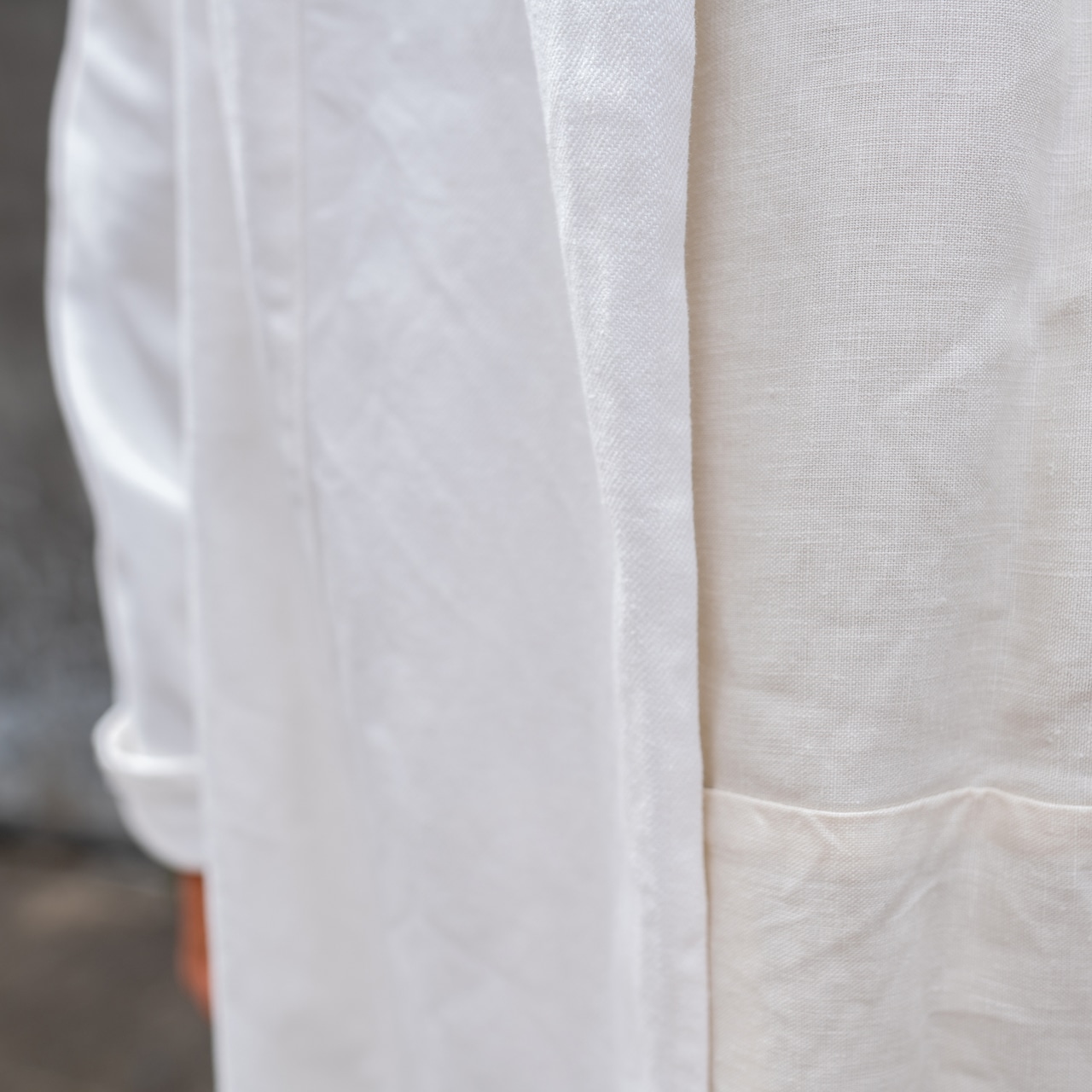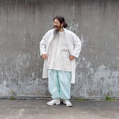 付属の紐で軽く結んで着るとキリッとした表情となり、紐が苦手な方は外してそのままラフに羽織って頂くと気取らないナチュラルな印象に。