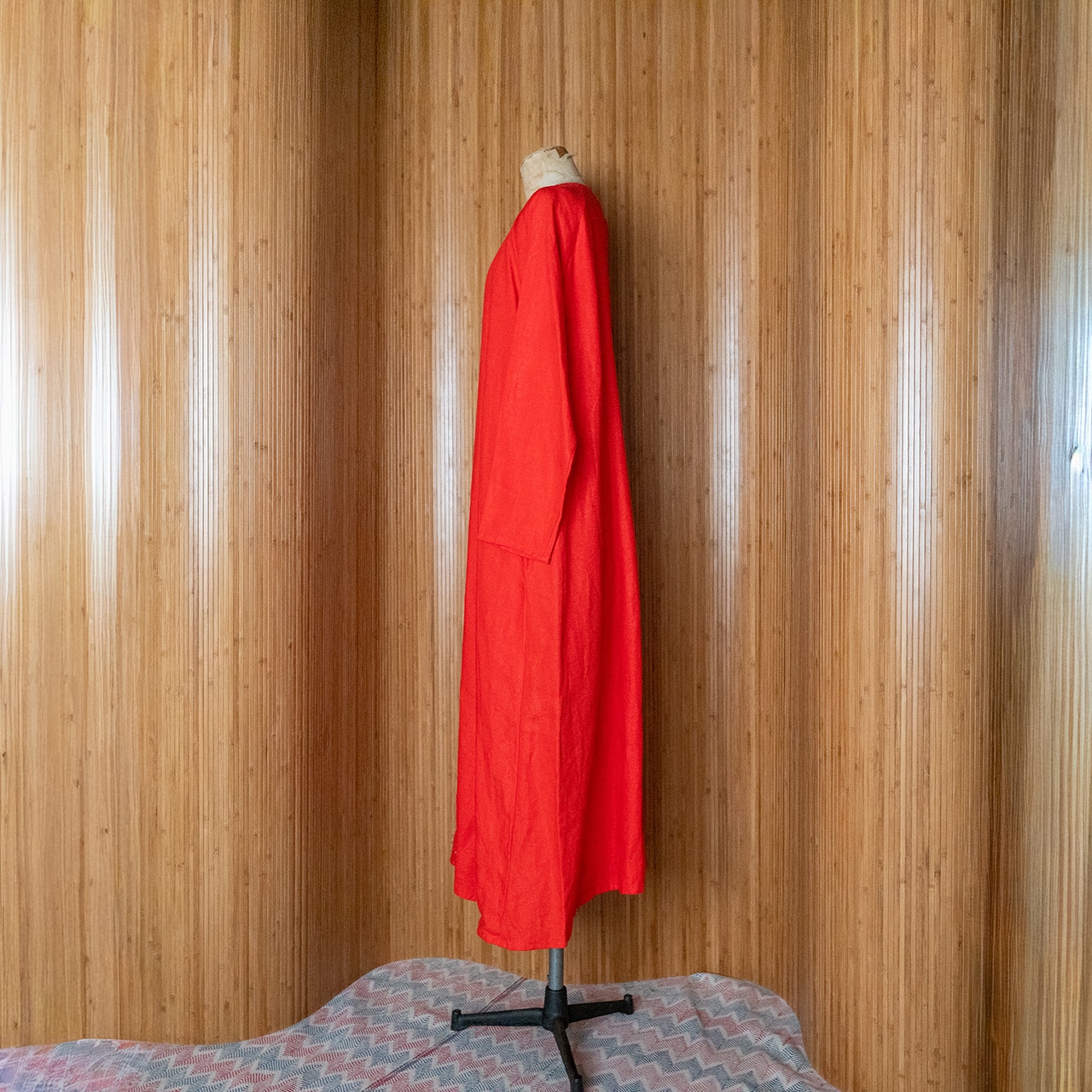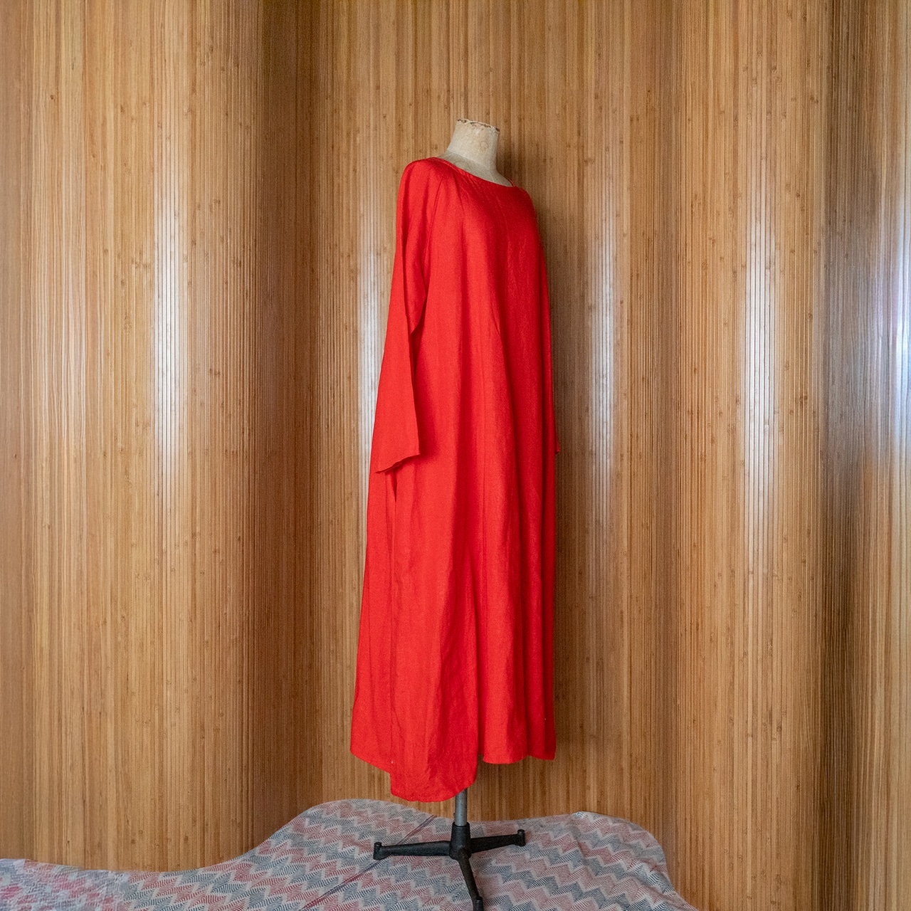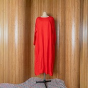 ラグランスリーブ仕立ての緩やかな袖ラインと、広がり控えめなAラインのロングワンピース。