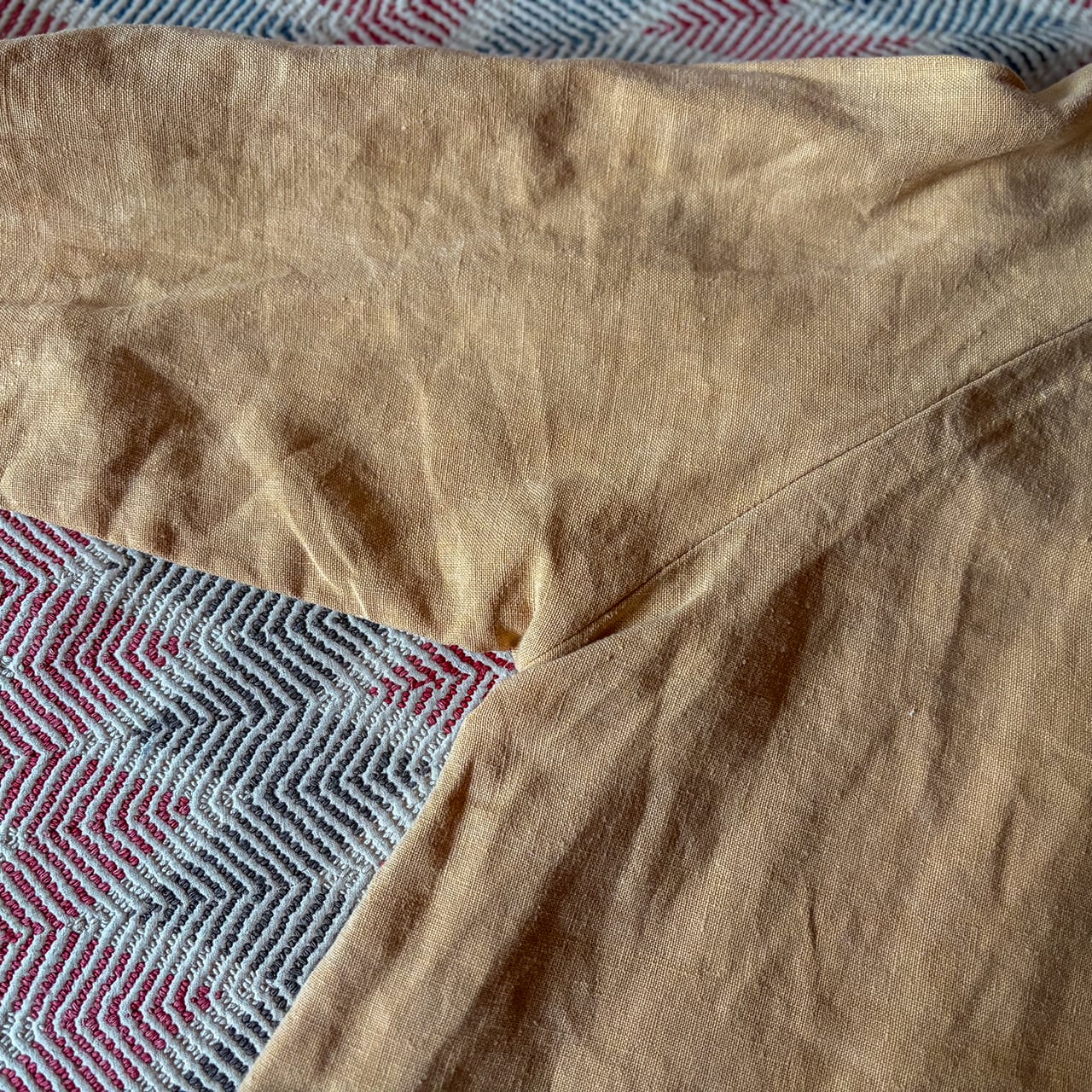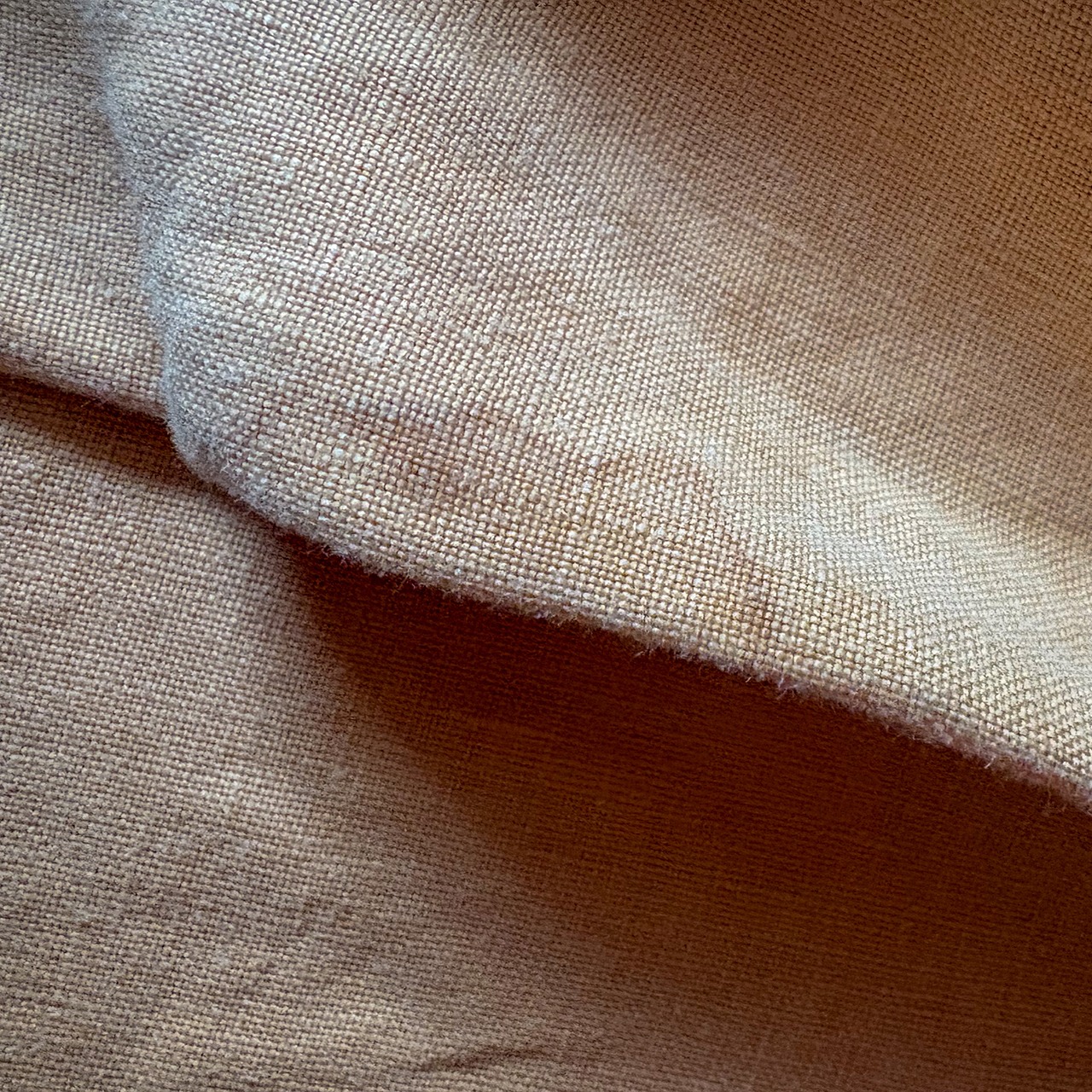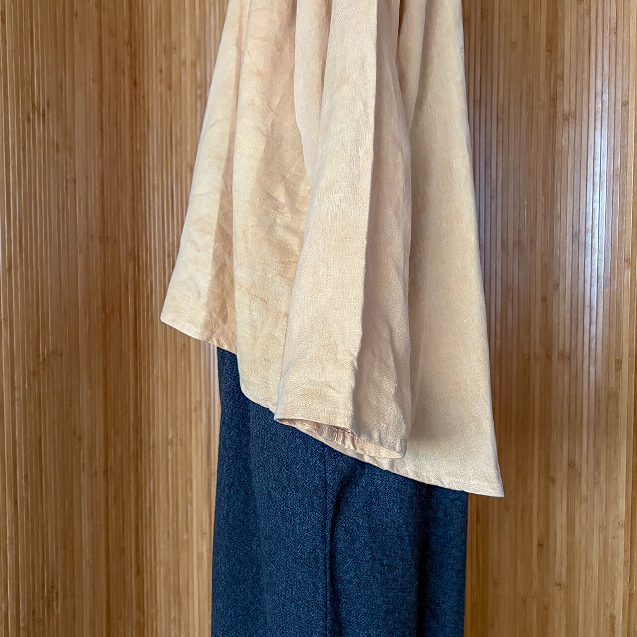 ご縁あって陶芸の釉薬を使われる際に用いるガネミソを用いて染めをされている方に、我々が使うリネン生地を染めていただいた特別な逸品。