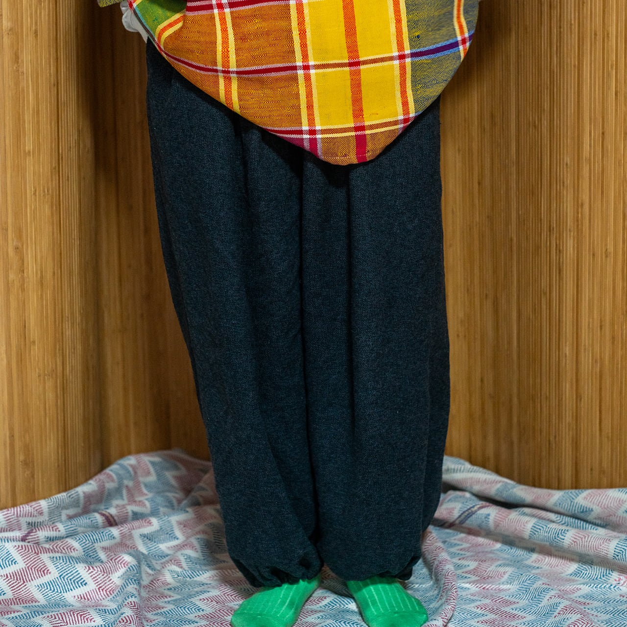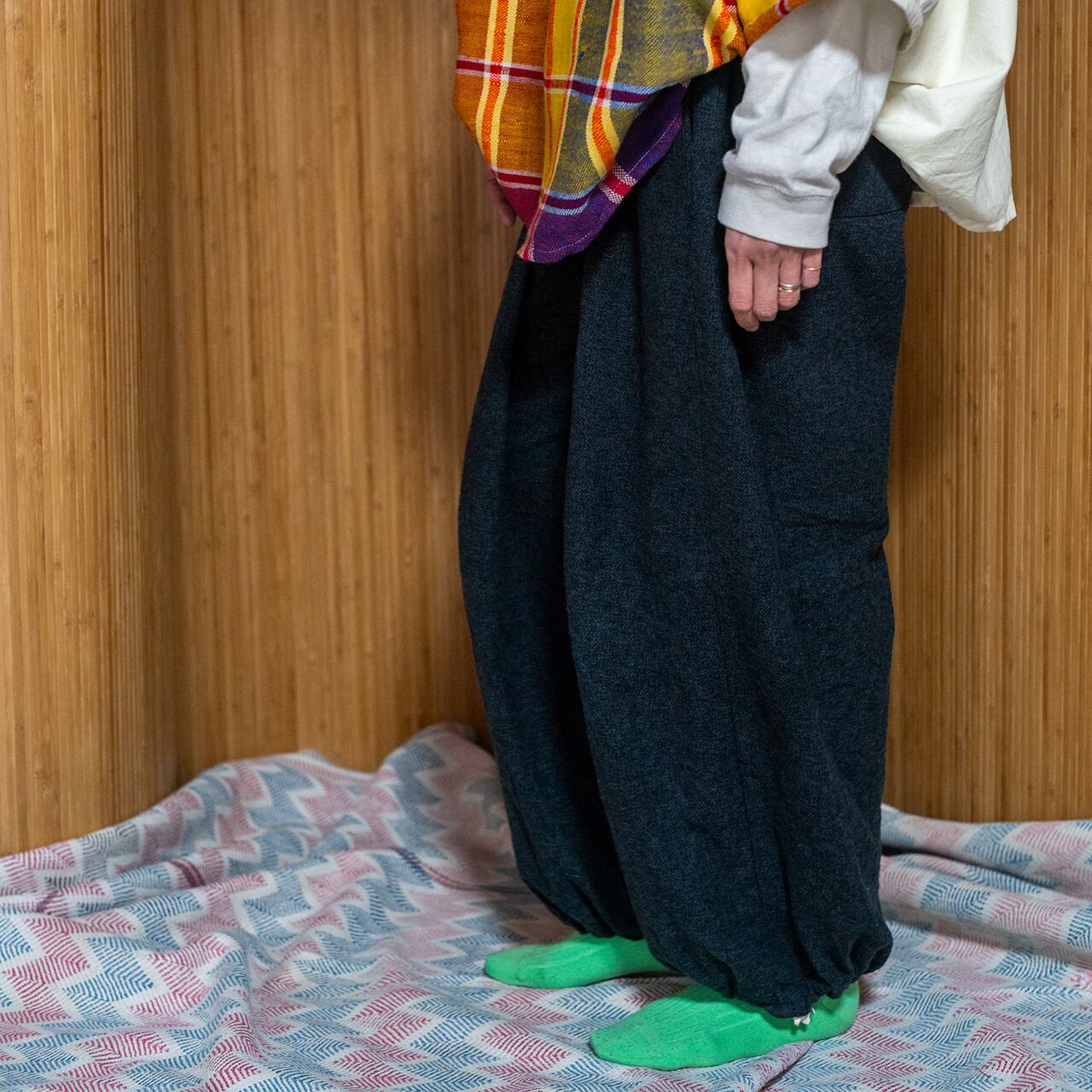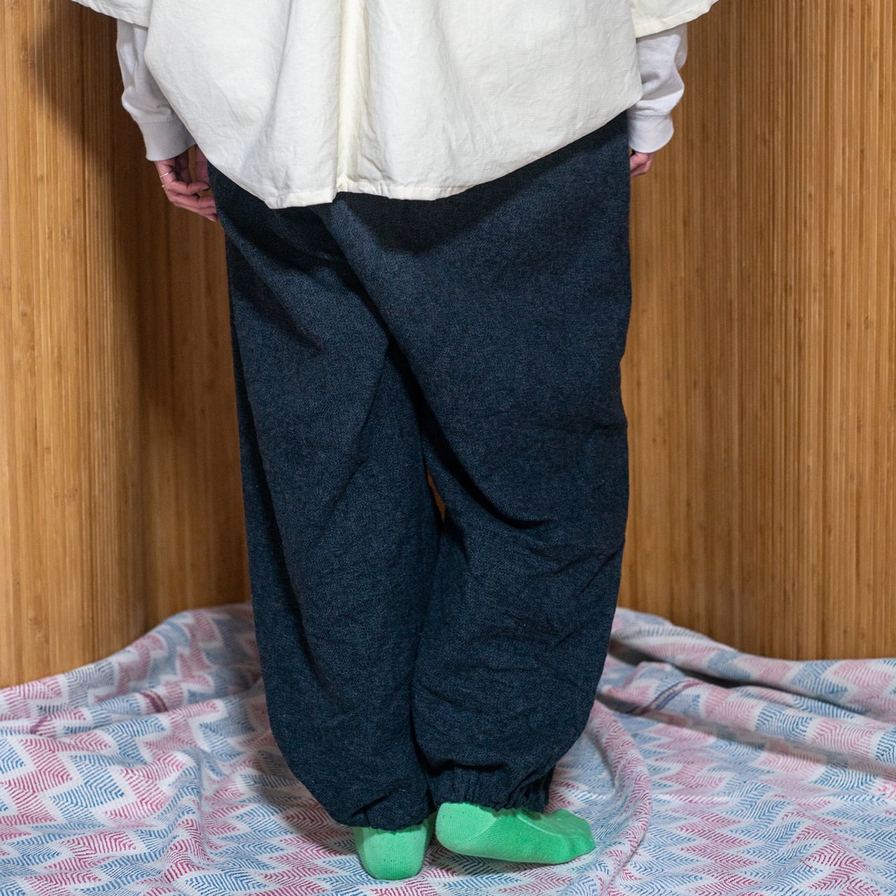 裾を絞ればカジュアルな雰囲気でかなり太めのClown Pantsのようなシルエットのパンツ