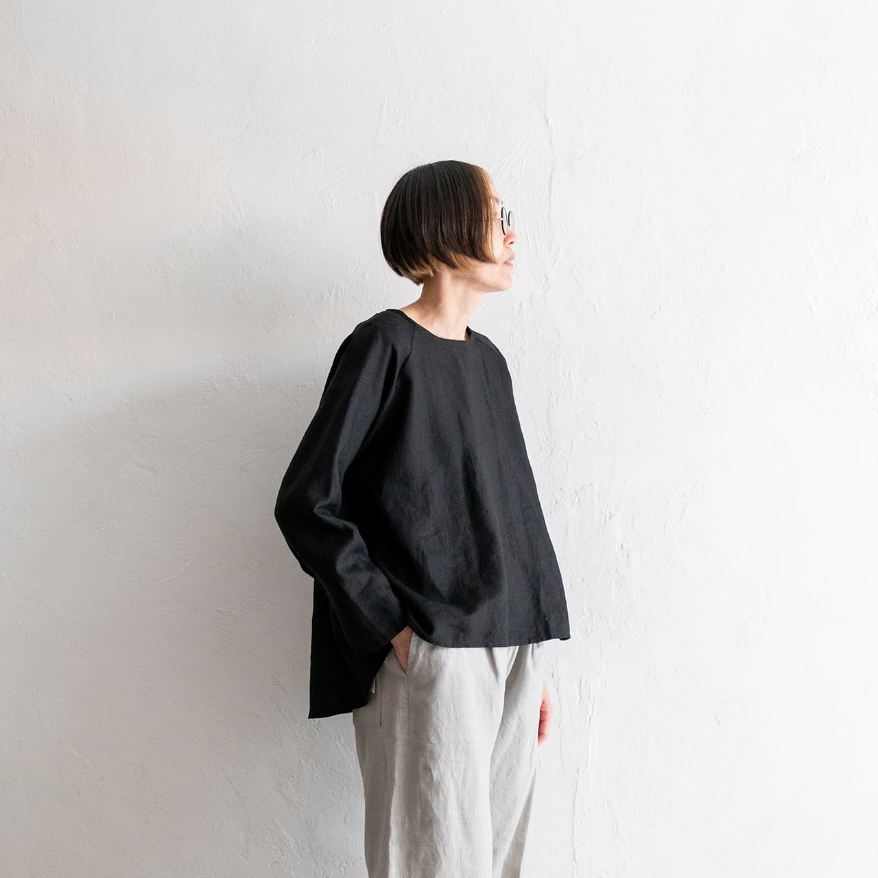 ラグラン袖となっていて、肩のラインがスッキリ美しく、シンプルな形ながらも一枚で様になる、とても着やすいデザインとなっています。