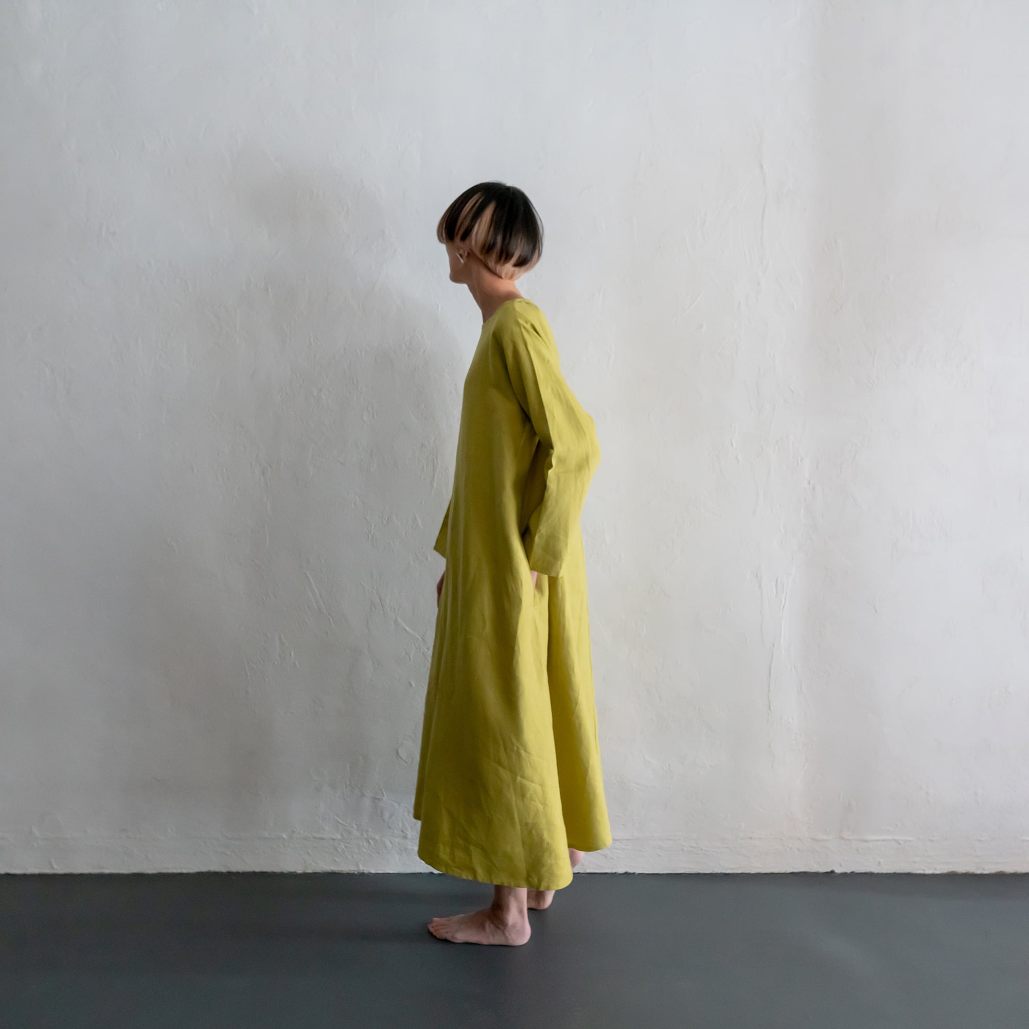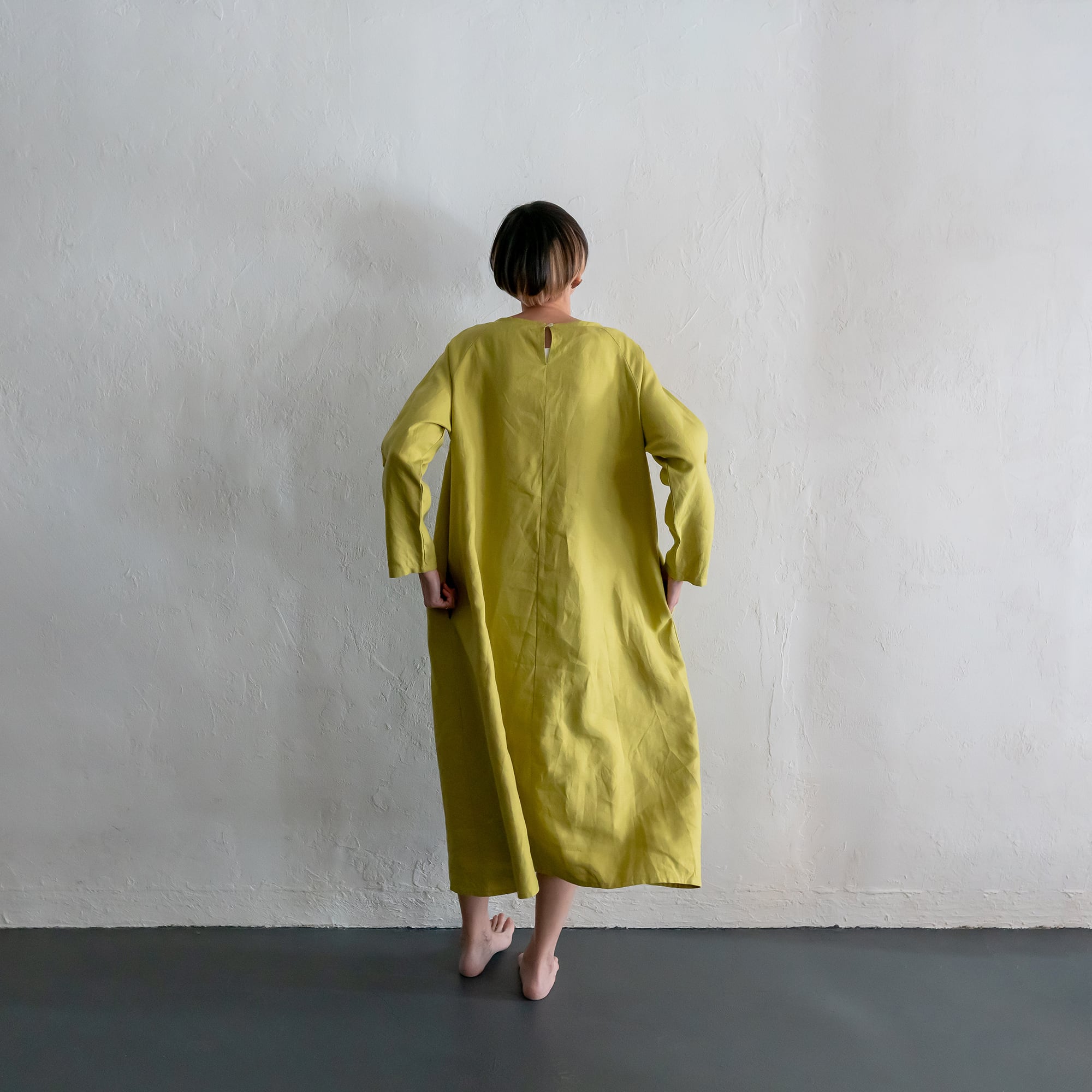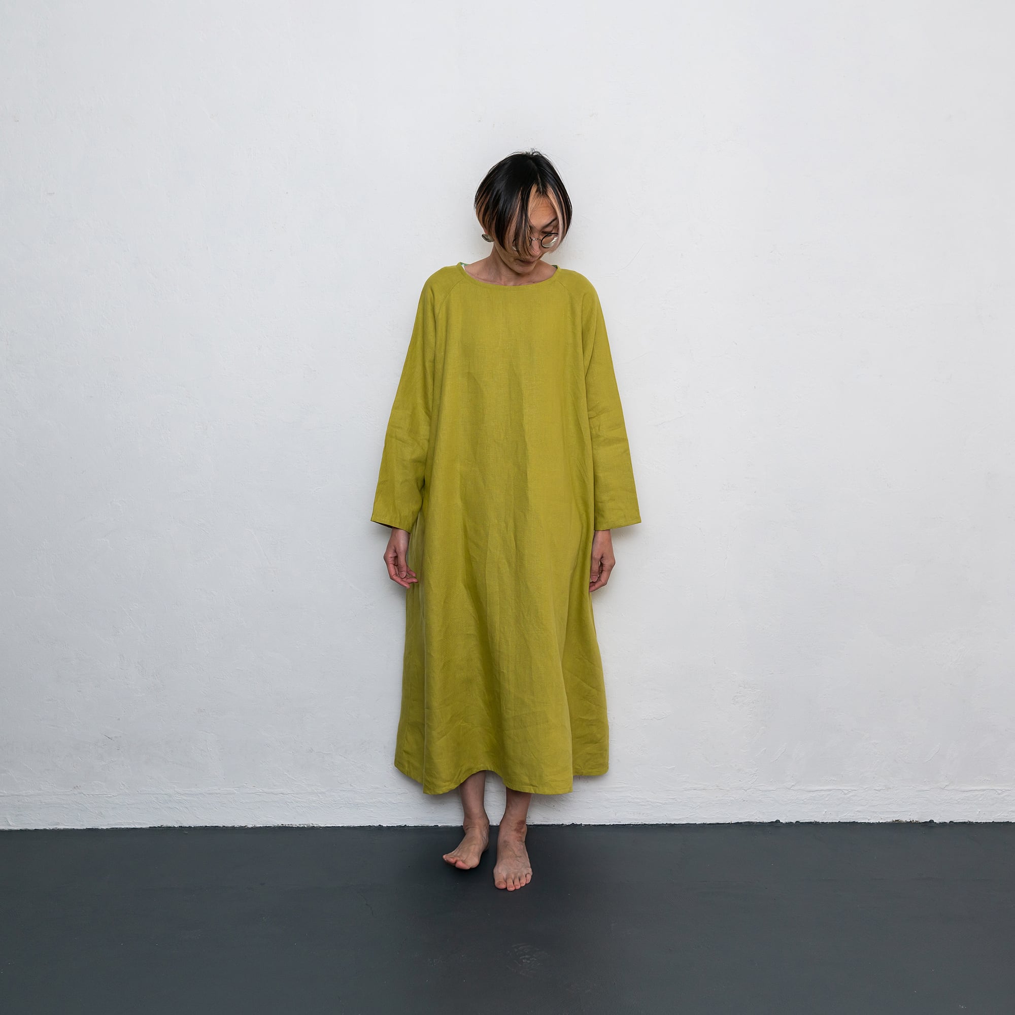 ラグランスリーブ仕立ての緩やかな袖ラインと、広がり控えめなAラインのロングワンピース。