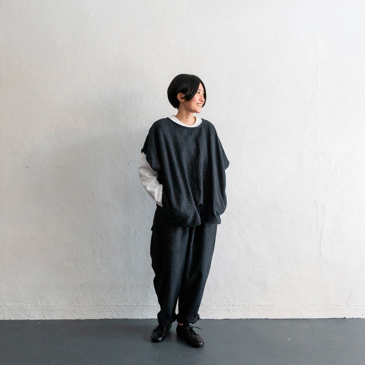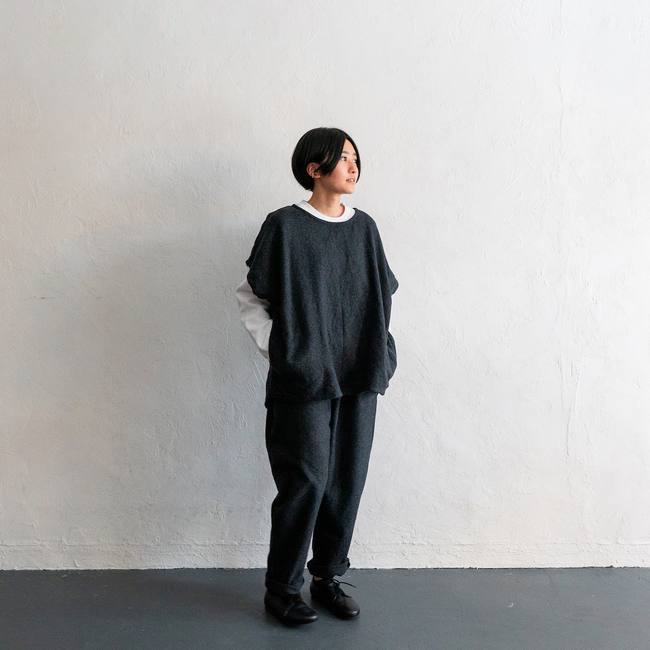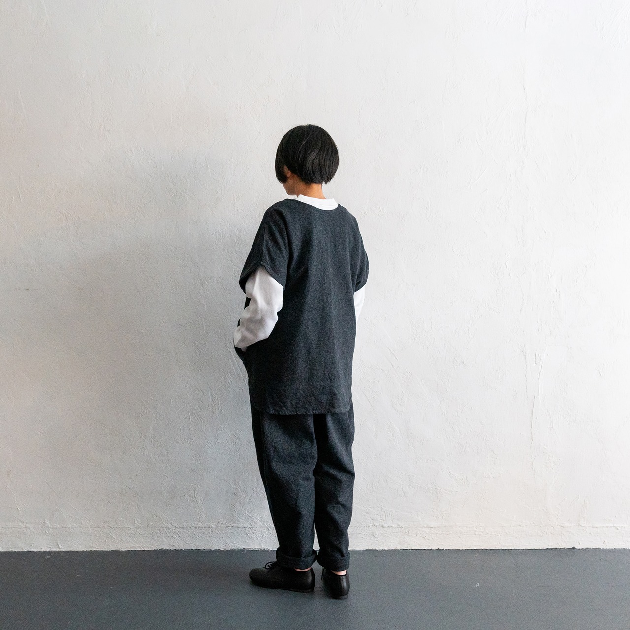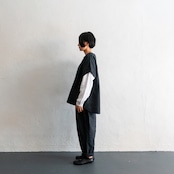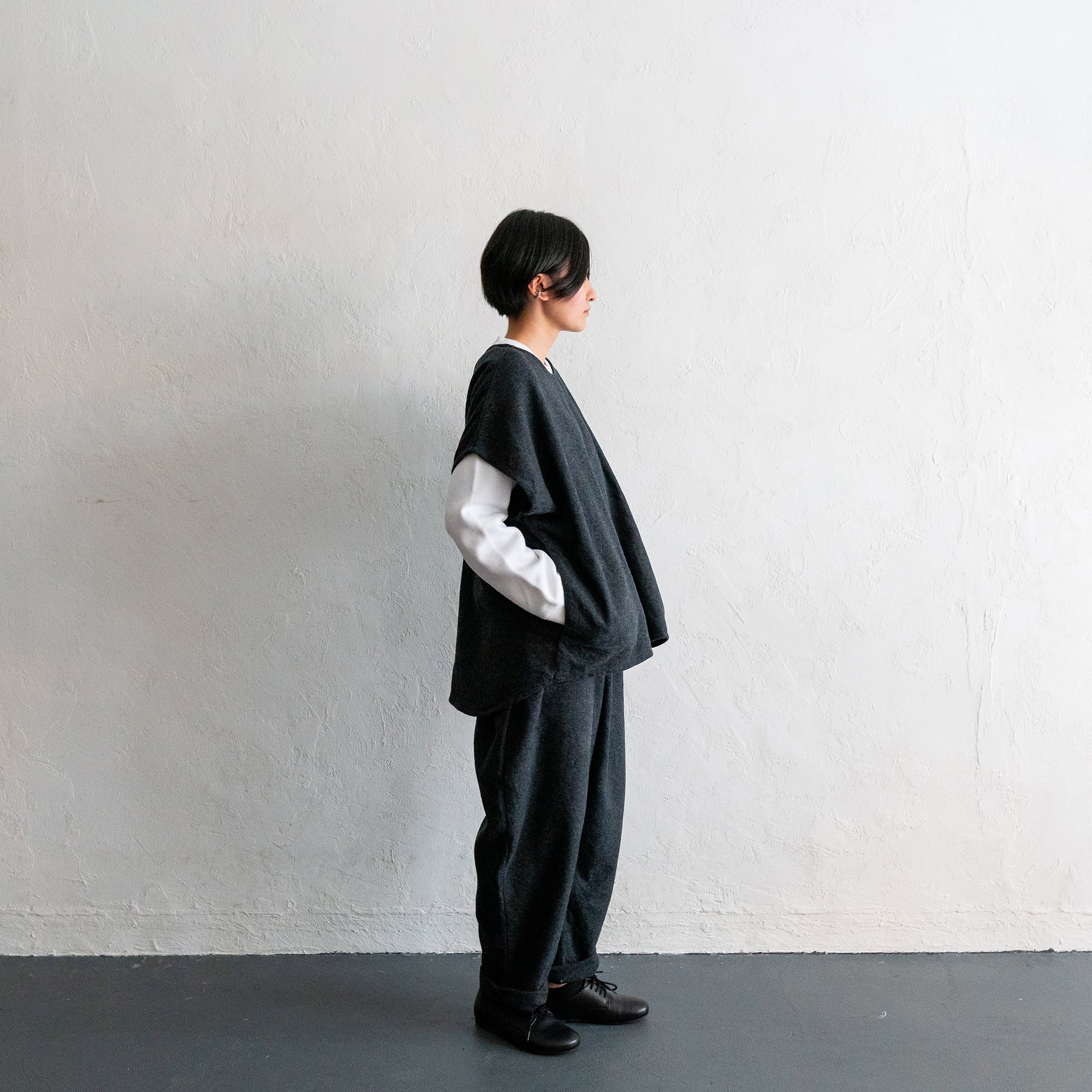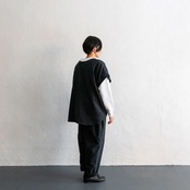 短めのトップスと合わせて、このパンツの最大限のデザインを活かす着こなしも、ワンピースやロングスモックの下に履いてもスッキリみえるように、合わせるアイテムで変化を楽しんでもらえるデザインとなっています。