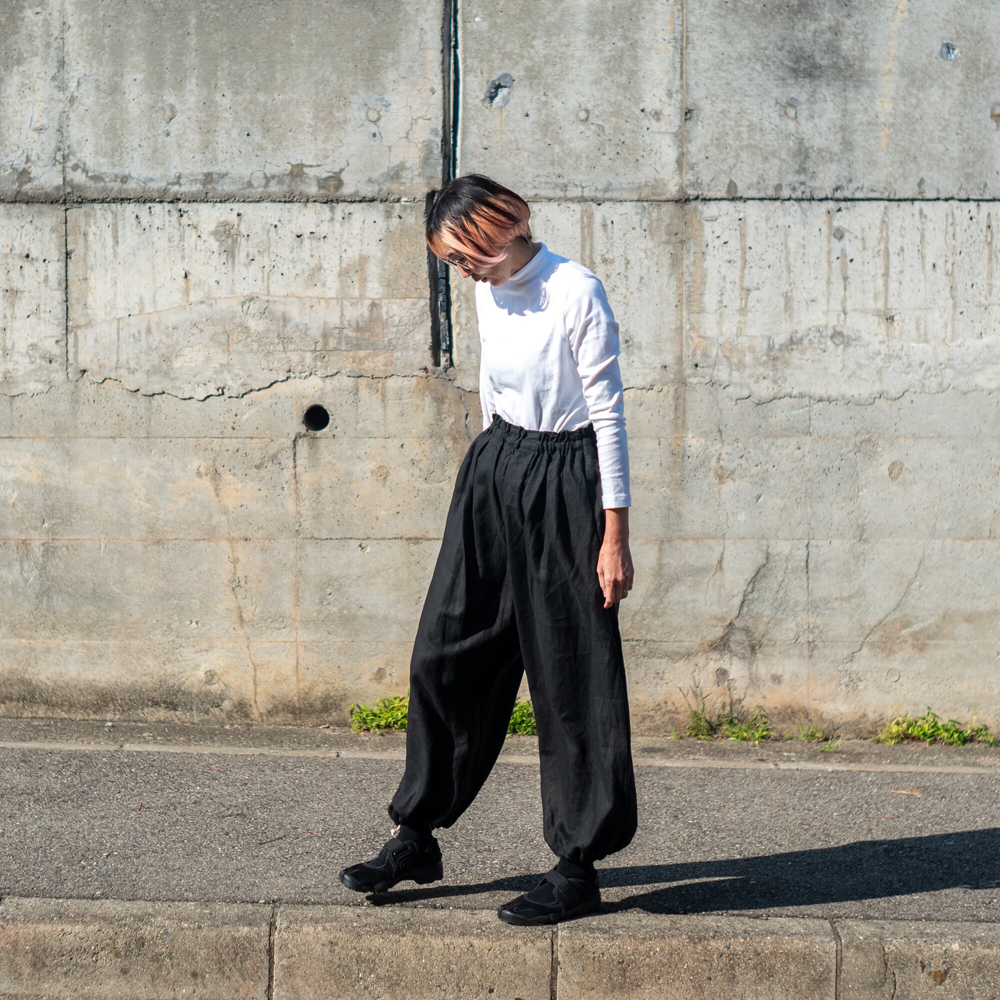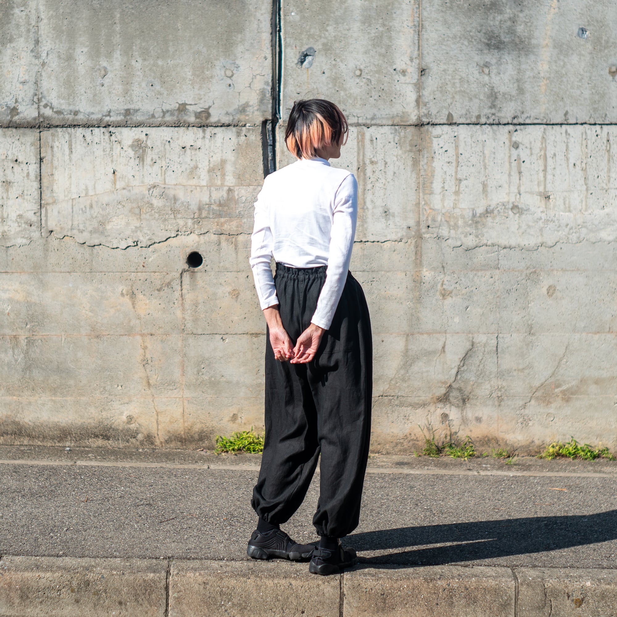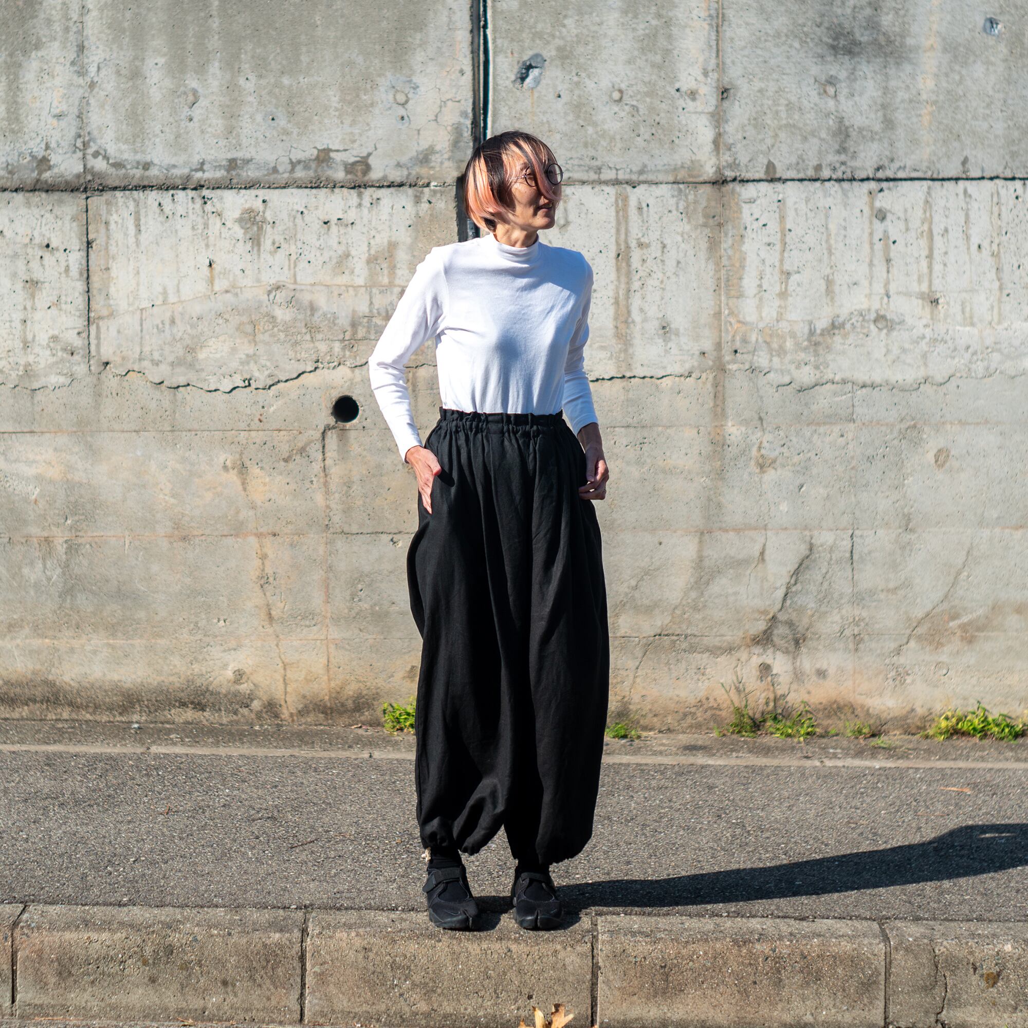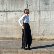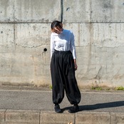 裾を絞ればカジュアルな雰囲気でかなり太めのClown Pantsのようなシルエットのパンツ